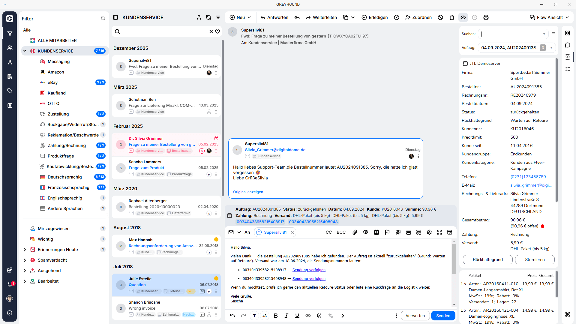 Du liebst es aufgeräumt und willst einfach nur Anfragen effizient beantworten? Dann ist der GREYHOUND Webclient genau das Richtige für dich. Ob direkt im Webbrowser oder als native Desktop App für macOS und Windows – funktional auf das Wesentliche reduziert, ist der Webclient das Mittel der Wahl zur schnellen und effizienten Bearbeitung von Anfragen und Dokumenten. Eine Chat-ähnliche Ansicht, der sogenannte Flow, garantiert schnellste Einlese- und Bearbeitungszeiten. Die intuitive und blitzschnelle Suche sorgt dafür, dass du immer alles griffbereit hast, was du zur Bearbeitung offener Vorgänge brauchst.